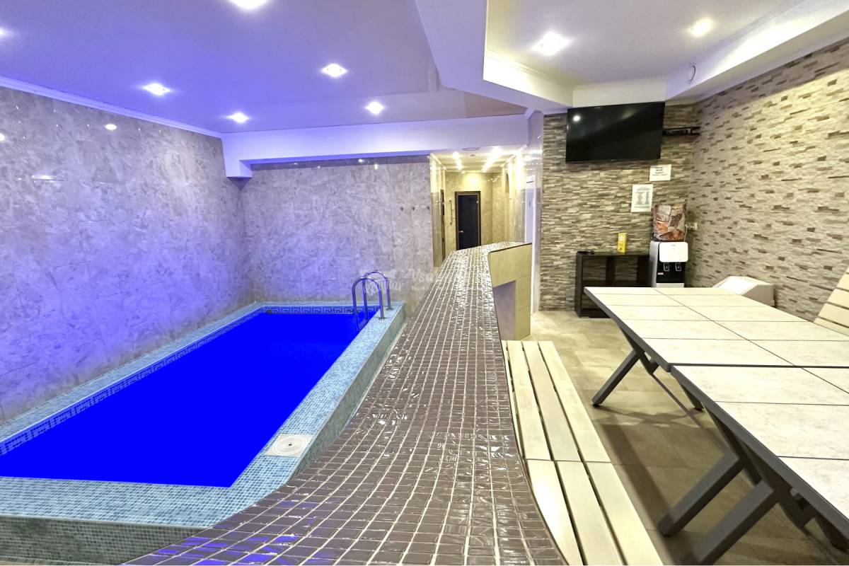 Бассейн 5х2.50 метра - с противотоком глубиной 1,7 метра, с теплой водой до 28 градусов. (вода проходит очистку через кварцевые фильтры, облучается ультрафиолетом и обеззараживается озонатором)